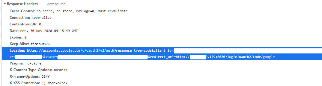 Location header 내 쿼리스트링의 "redirect_uri" 의 값에 내부 ip가 찍히고 있었다.