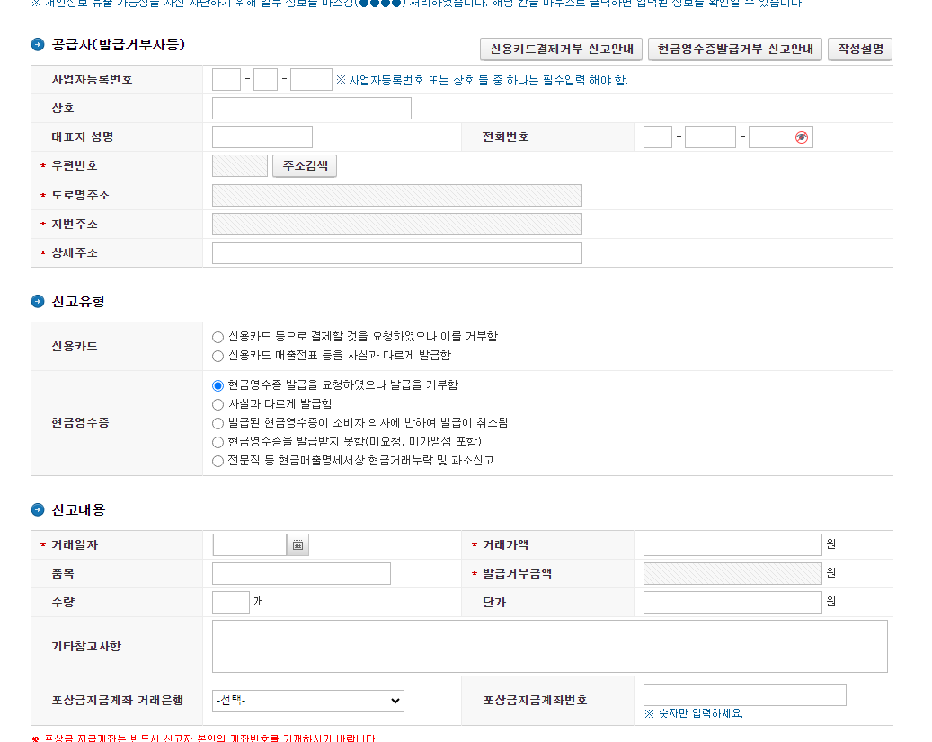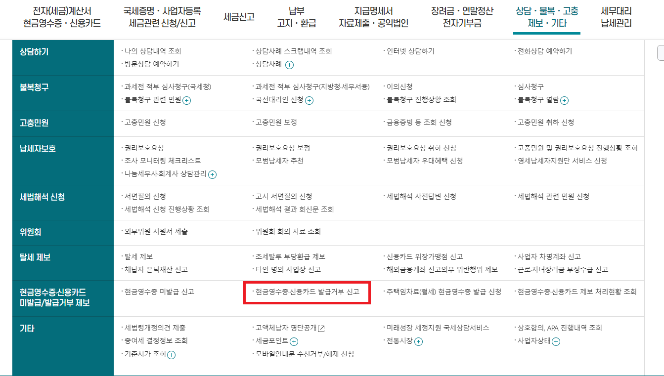 들어가서 "현금영수증 · 신용카드 발급거부 신고" 를 들어간다.
