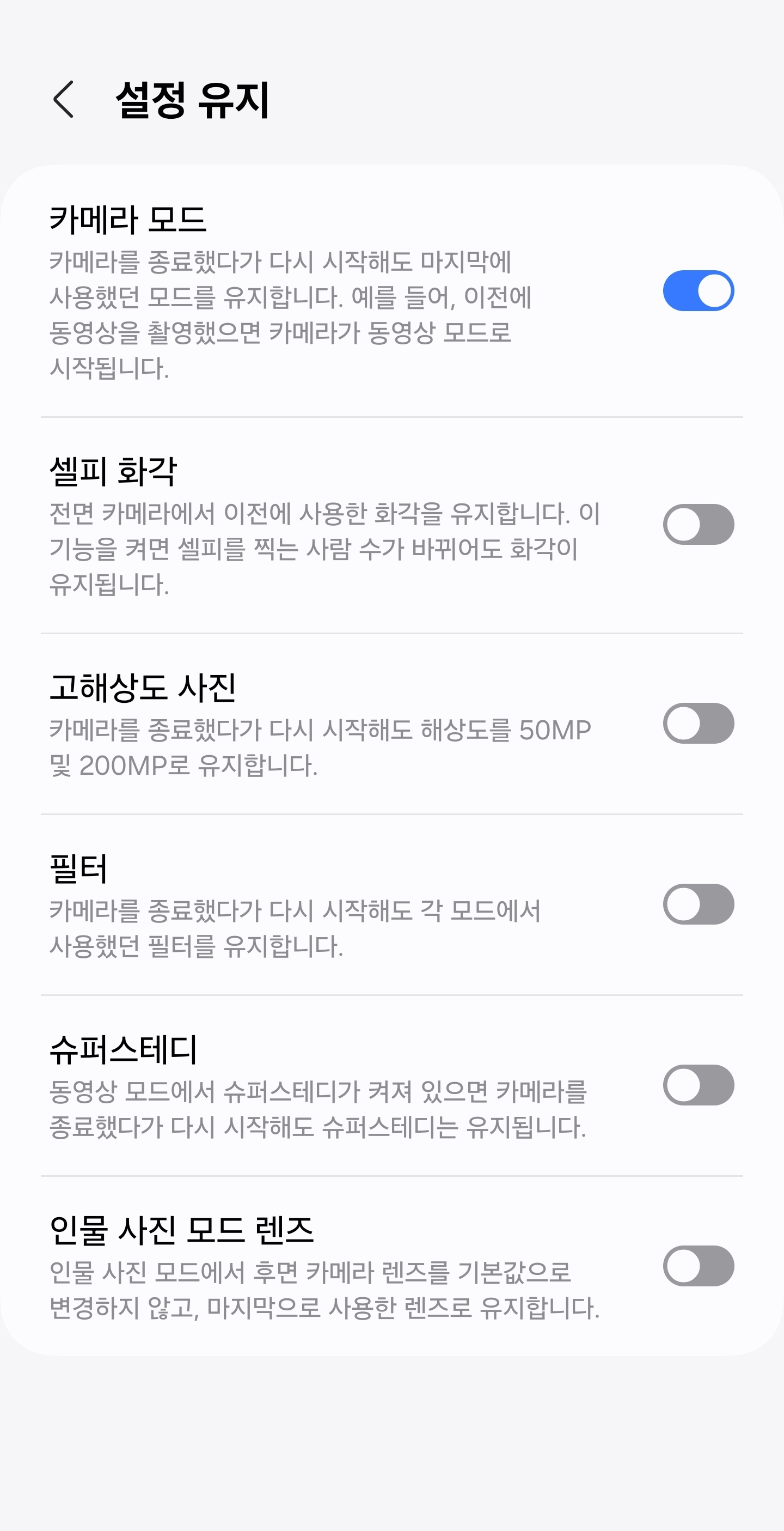 이걸 사용하면 영상을 찍다가 카메라를 껐다 켰을 때 카메라가 사진촬영으로 세팅되지 않고 영상촬영으로 바로 세팅이 된다.