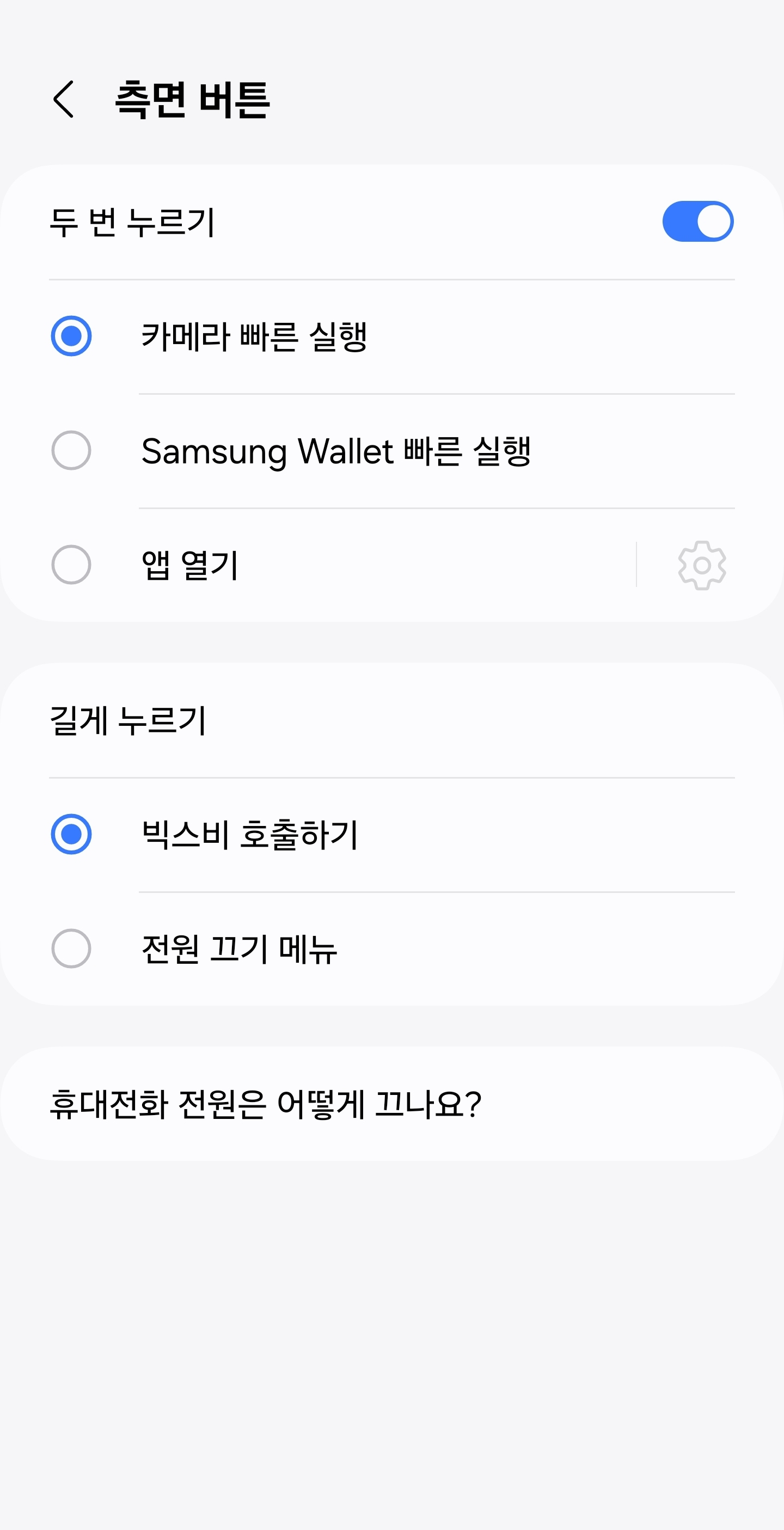 두번 누르기에 "카메라 빠른 실행"을 설정한다.